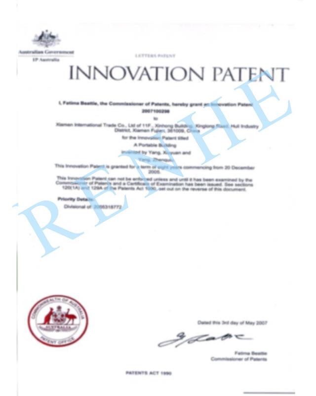 活動(dòng)房外觀專(zhuān)利設(shè)計(jì)證書(shū)