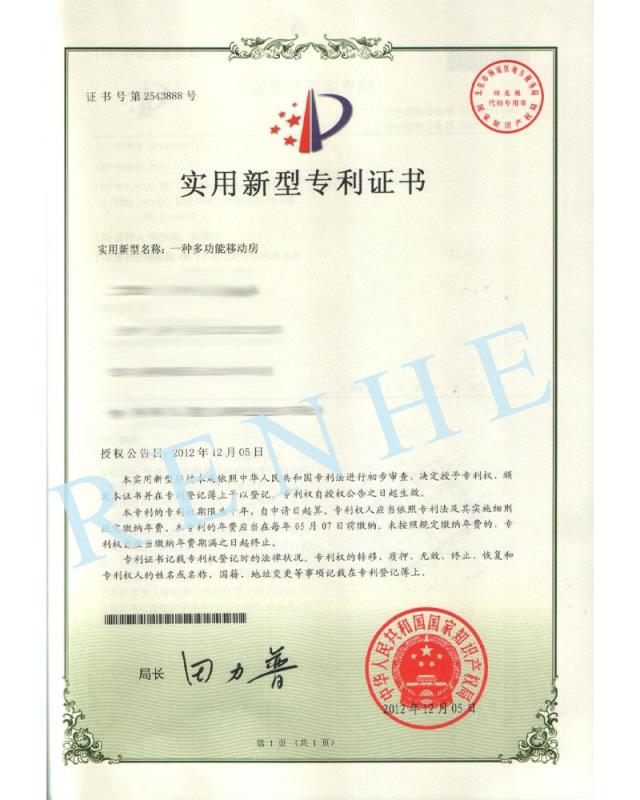 一種多功能移動(dòng)房實(shí)用新型專(zhuān)利證書(shū)