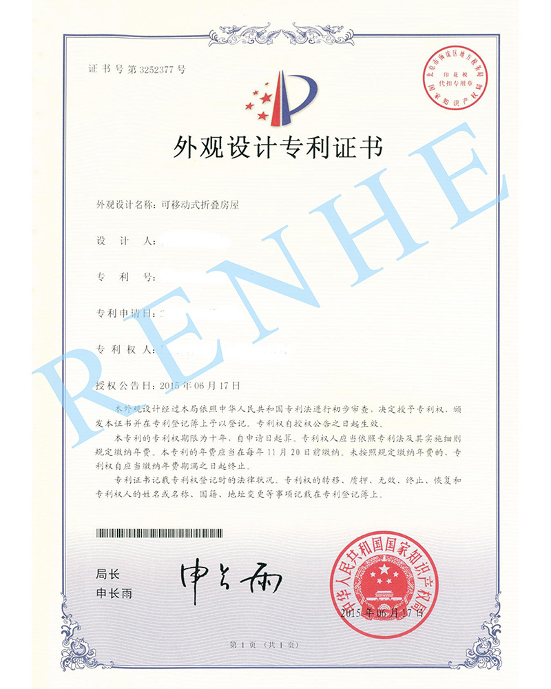 可移動(dòng)式折疊房屋外觀設(shè)計(jì)專(zhuān)利證書(shū)